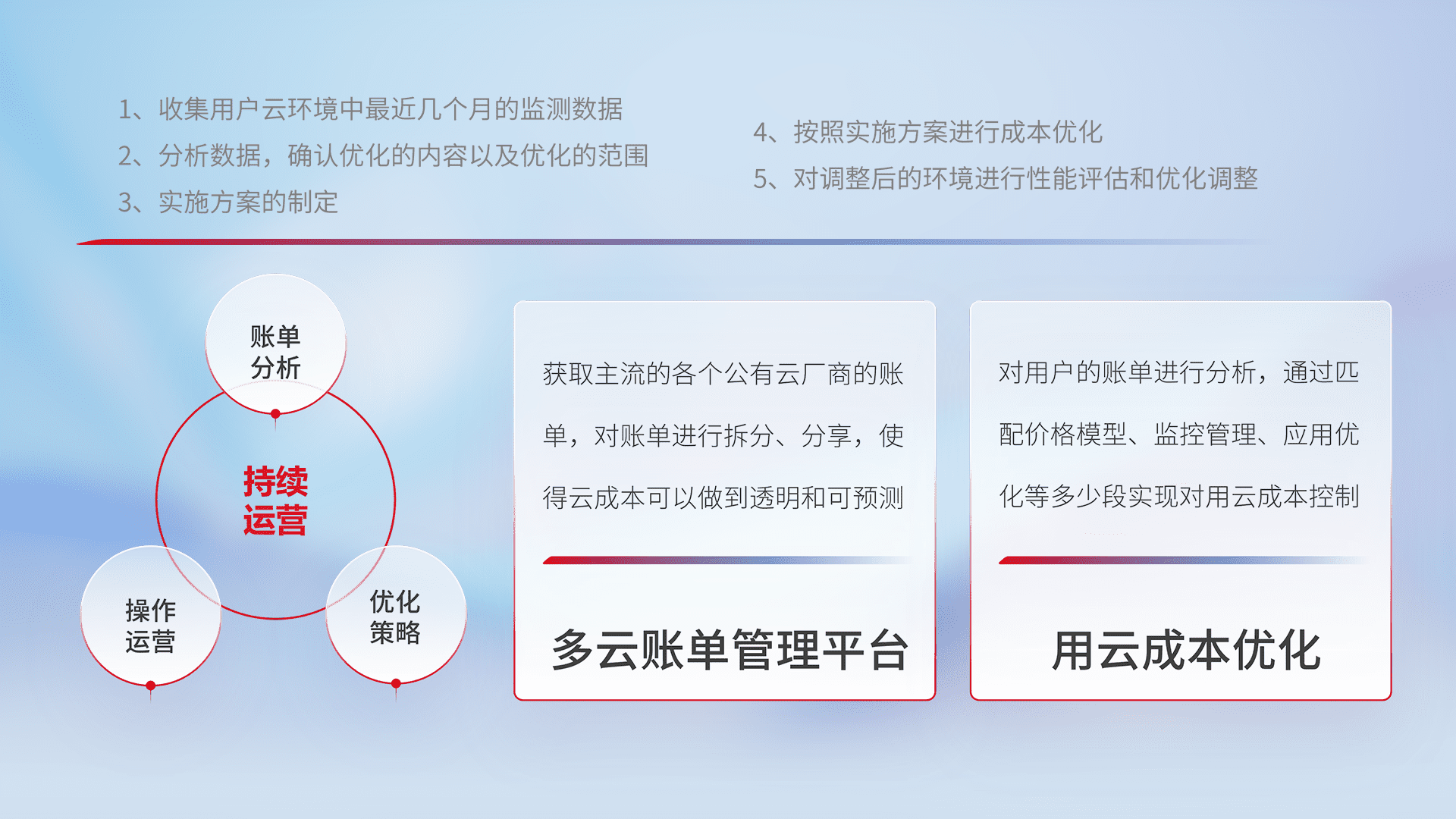 通过多云纳管,,,以统一的资源数据模型把客户的云资源进行抽象和封装,,,进而实现对多云资源的统一操作,,保障云资源管理的可靠性、、、稳定性与可用性。。量身定制化运维内容,,,,配置、、开发运维、、、补丁管理、、、备份、、监控、、认证和访问管理、、、、审计和日常巡检等,,保障在用云过程中的可靠度,,,,稳定度以及高可用率。。