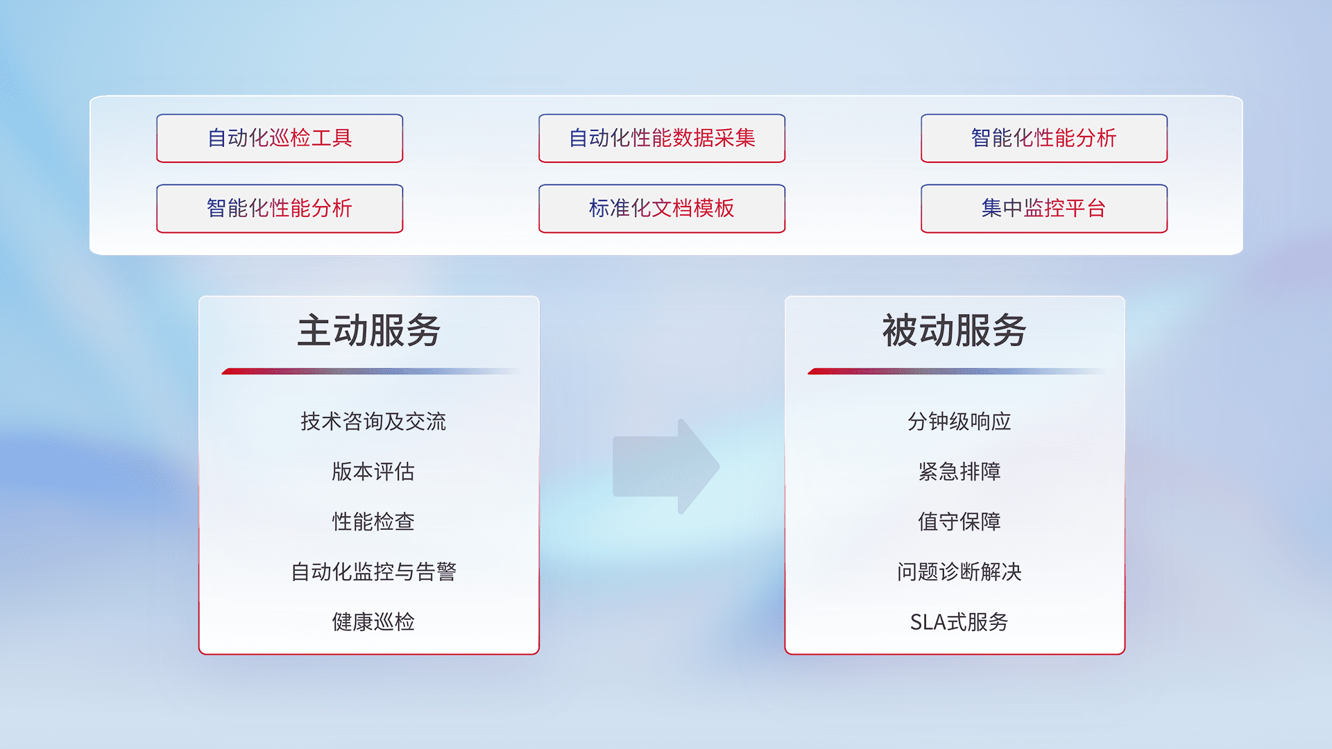 智能化工具和标准化文档,,,保障服务质量,,提供主动服务(包含技术咨询、、、版本评估、、、性能检查、、、自动化监控与告警、、、、健康巡检)和被动服务包含(分钟级响应、、、紧急排障、、、值守保障、、、、问题诊断解决、、、、SLA服务)。。。。